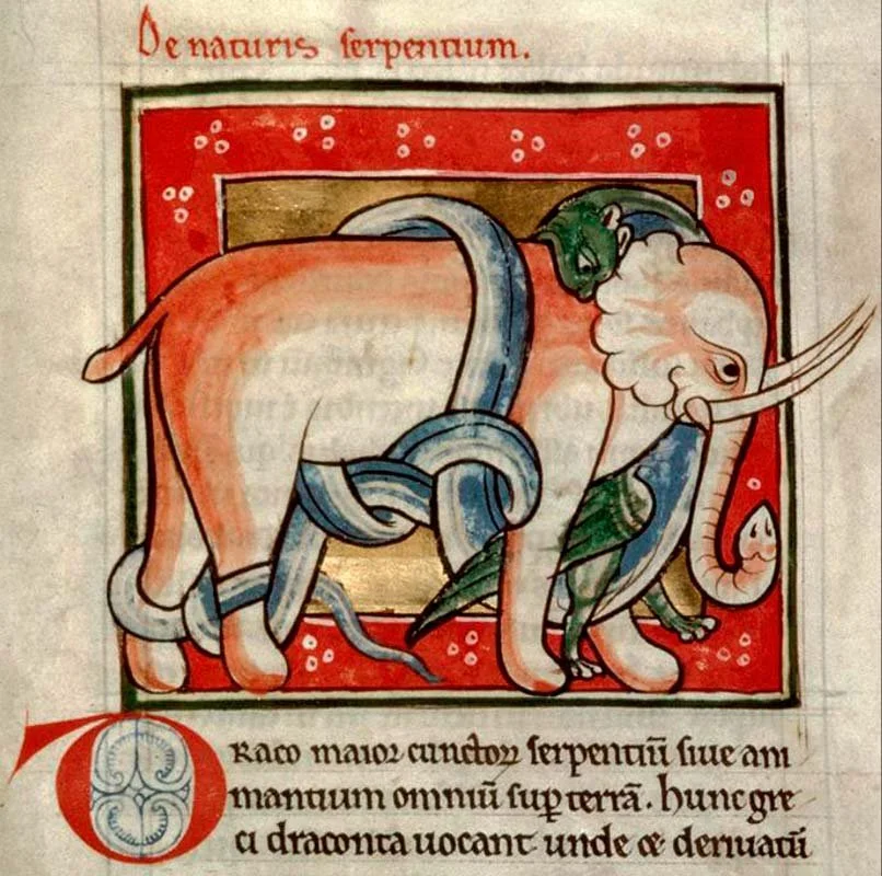Une croyance médiévale du même style est assez éclairante. En effet, à l’époque, on pensait que les résines rouges utilisées par les peintres venaient du sang de dragon, tué par un éléphant. Sans doute était-ce lié à l’existence de la résine provenant de l’arbre “dragonnier”, les branches de cet arbre font, de surcroît, penser à des serpents.